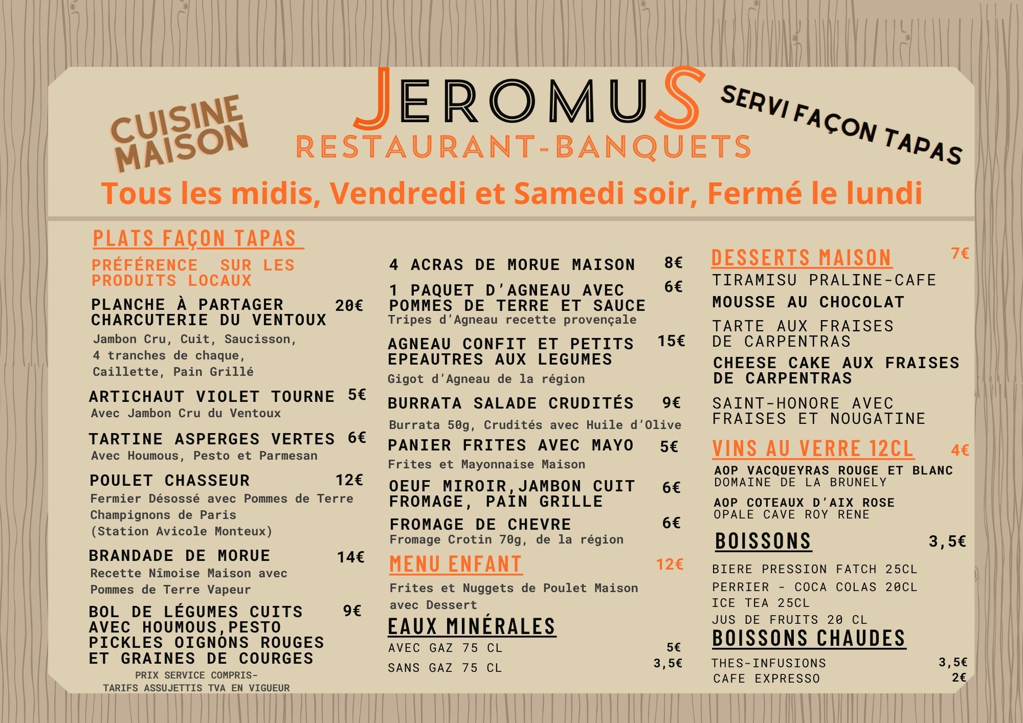 JEROMUS Restaurant Traiteur propose une cuisine authentique au four à bois depuis une trentaine d'années. Nous disposons d'une salle de restaurant de 25 places assises, une salle véranda pour les groupes de 70 places assises et d'une grande terrasse ombragée en saison. Ouvert toute l'année nous sommes heureux de vous recevoir sur notre domaine.